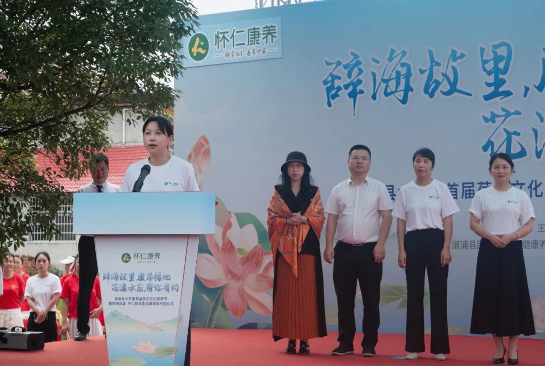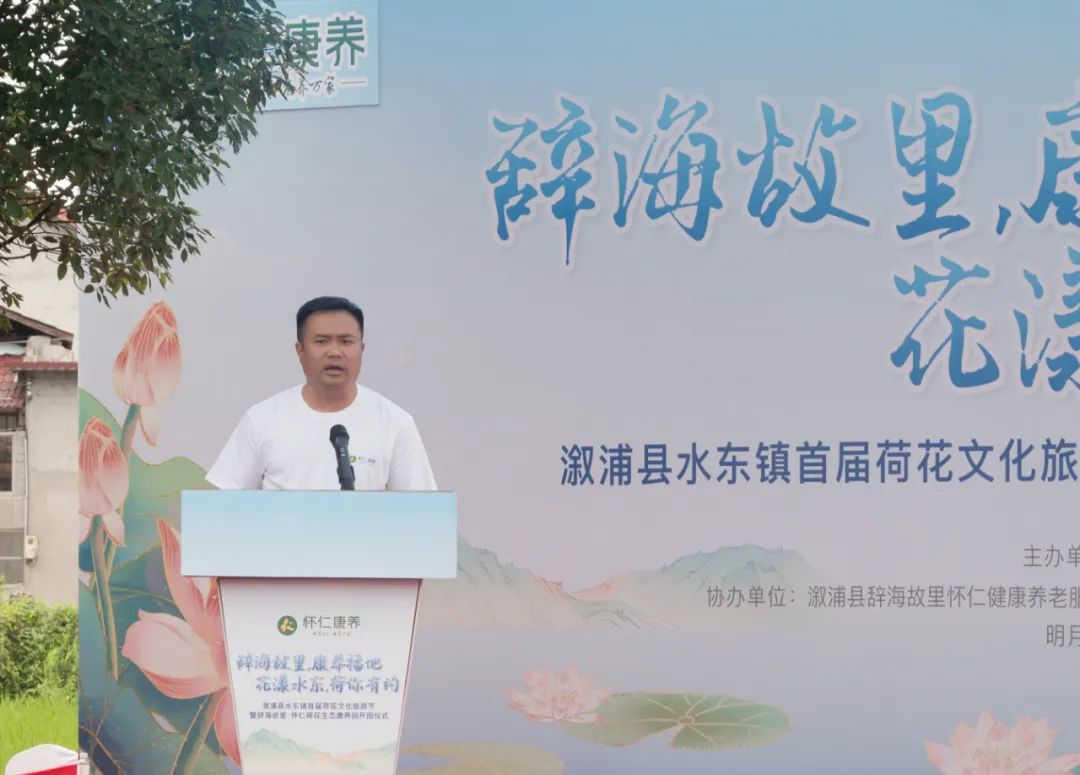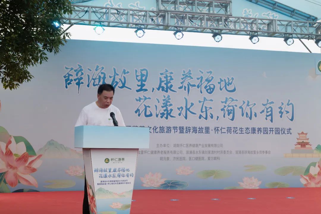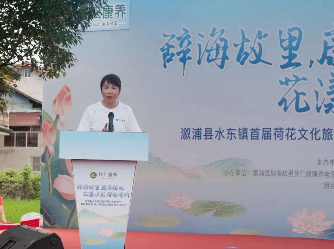 石艳梅对各位领导、嘉宾和游客的到来表示热烈的欢迎和衷心的感谢。她说,水东镇物产资源丰富,文化底蕴深厚,自然风光与人文景观交相辉映,使我镇成为研学游、农文旅融合发展的理想之地。刘家渡村是我国现代著名教育家、出版家、辞书编纂家、“辞海之父”舒新城的故乡,舒新城故居、湘西小南岳、溆浦都江堰、百亩荷花园等资源禀赋,“全国民主法治示范村”“全国乡村治理示范村”等金字招牌,成就了“辞海故里•康养福地 花漾水东•荷你有约”的文旅品牌。她指出,怀仁医养公司的投资入驻,首届荷花文化旅游节的成功举办,怀仁荷花生态康养园的顺利开园,为水东镇乡村振兴开启了田园康养旅游的新篇章,为发展壮大新型农村集体经济注入了强劲动力。她诚挚邀请社会各界朋友莅临水东,共赏美景、细品文化、同享盛宴。