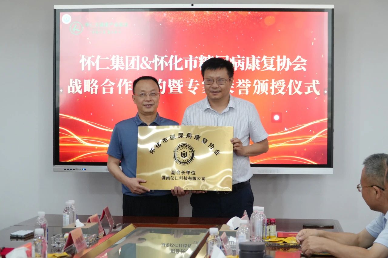 怀化市糖尿病协会为ayx爱游戏(中国)官方网站-登录入口旗下的湖南亿仁科技有限公司授牌“怀化糖协副会长单位”,亿仁科技总经理王浩上台接受牌匾。