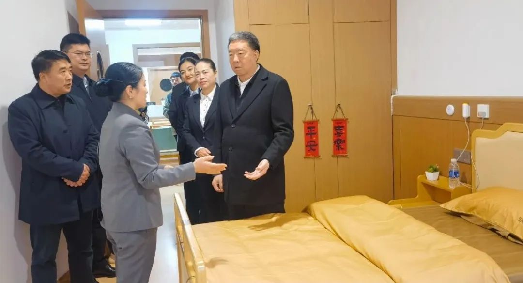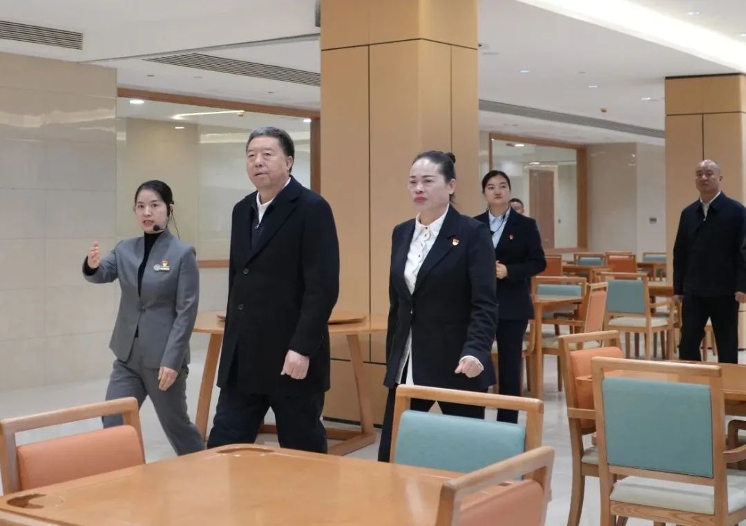 在康养苑五楼活力长者居住区,毛万春主席参观了样板间、综合活动室、功能室、阅读室、太极瑜伽练功房、乐器室、健身房等,详细询问了智能系统、配套功能设施、服务收费等。走在怀仁五调康养园的连廊里,环境雅致,绿树环绕,文化气息浓厚,令人愉悦。毛万春主席微笑地说:“这里关起门是家,推开门是花园。”