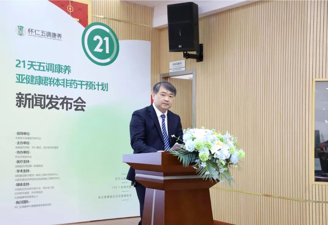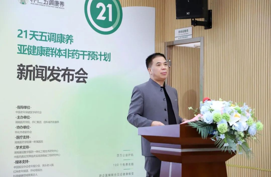 2月27日上午,由中国老年保健医学研究会指导,湖南医药学院、ayx爱游戏(中国)官方网站-登录入口、创科城市新康养主办,怀化市老龄协会协办,湖南医药学院第一附属医院医疗支持,湖南基层数字医防一体化工程技术研究中心、中医药真实世界临床实践湖南省工程研究中心学术支持的“21天五调康养·亚健康群体非药干预计划——百万公益护航·100个免费名额·研企医媒联合见证健康蜕变”新闻发布会在湖南怀化ayx爱游戏(中国)官方网站-登录入口圆满召开。本次发布会以“健康中国,怀仁先行”为主题,旨在积极响应国家《“健康中国2030”规划纲要》战略部署,践行“普怀仁爱,康民济世”的企业使命,通过非药干预的实践,打造100个具有代表性的全国案例和样板,为国家健康战略贡献怀仁的力量。