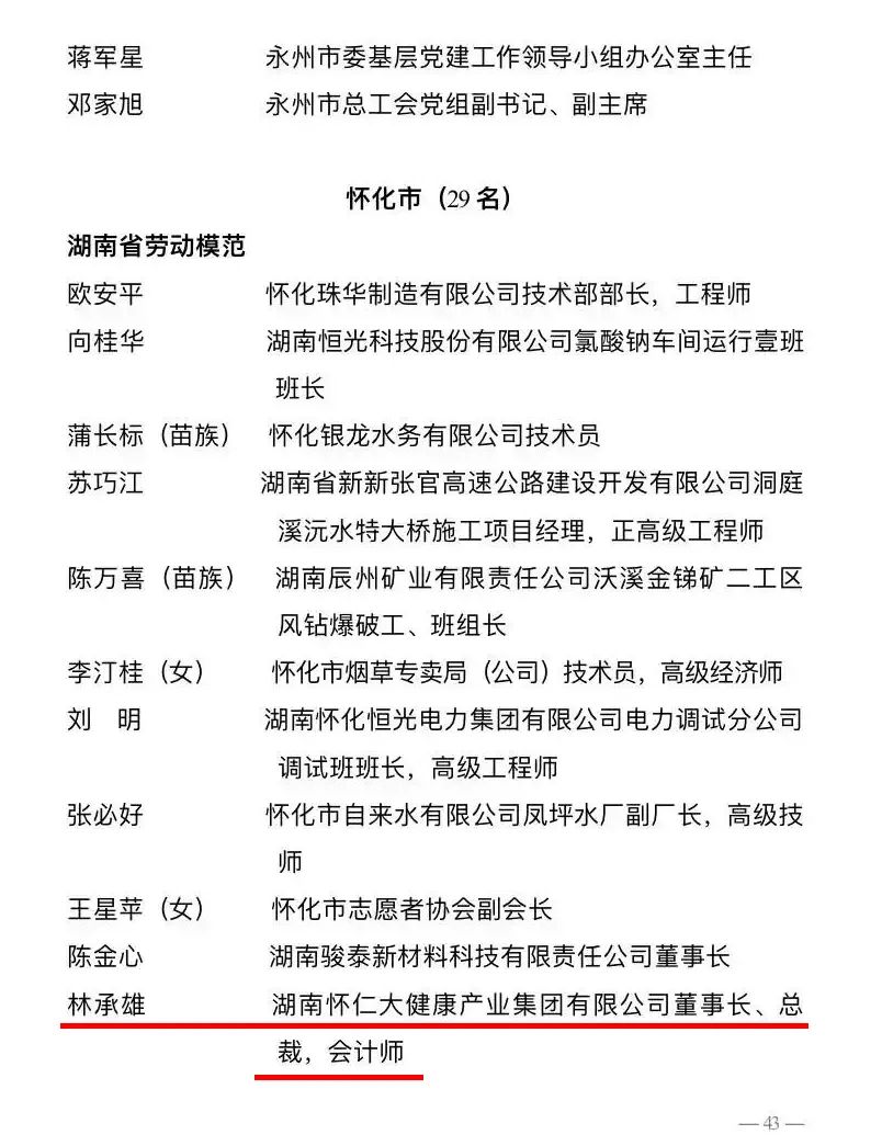 4月29日,2025年湖南省庆祝“五一”国际劳动节暨劳动模范和先进工作者表彰大会在长沙召开。省委、省政府对496名先进模范人物予以表彰,怀仁大健康产业集团董事长林承雄荣获湖南省劳动模范称号。